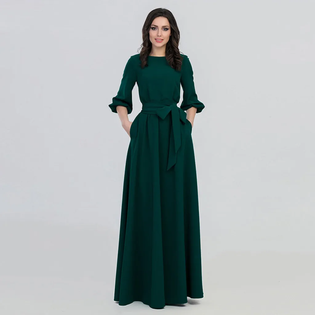 Women Summer Casual Party Dress Lantern Sleeve Solid Long Dresses With Belt